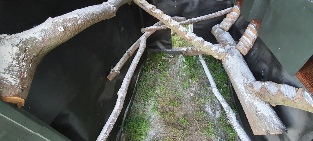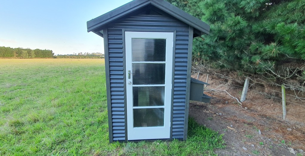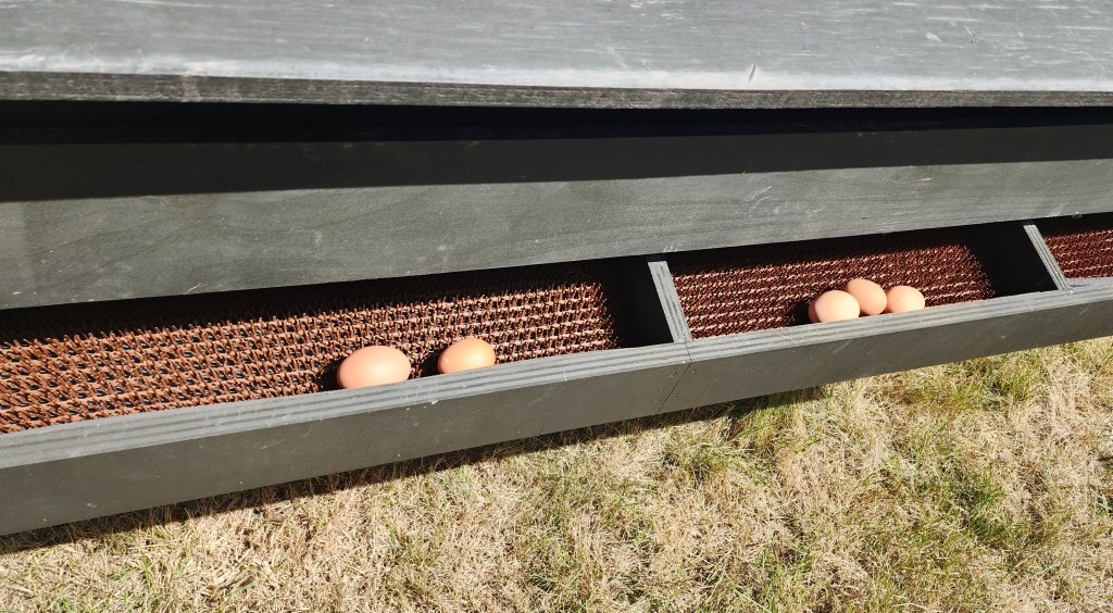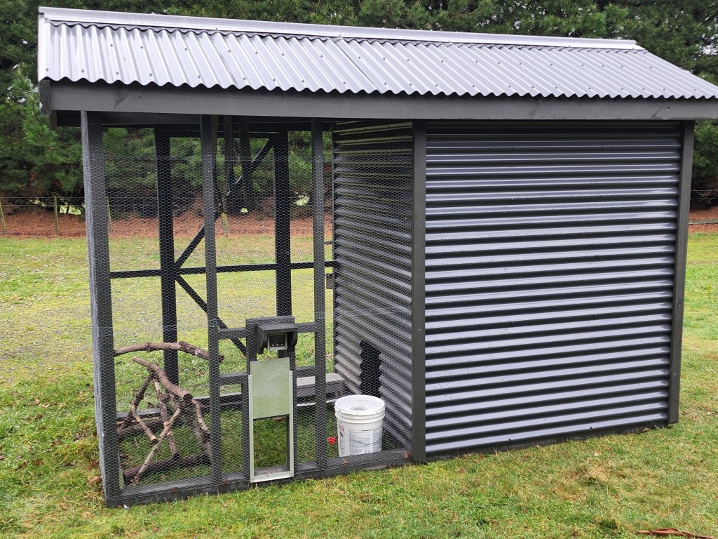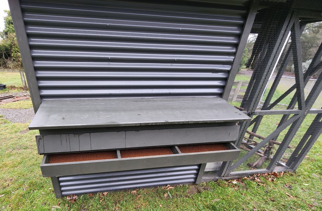 The walls and ceiling have 90mm insulation installed. It has vents covered in mesh up in the top of the gables for clean air. It has an automated door set for opening and closing on light levels. The nesting box is on a 10 degree fall so the clean eggs roll out into an unreachable holding bay and is easily washed out with drainage holes at the bottom.